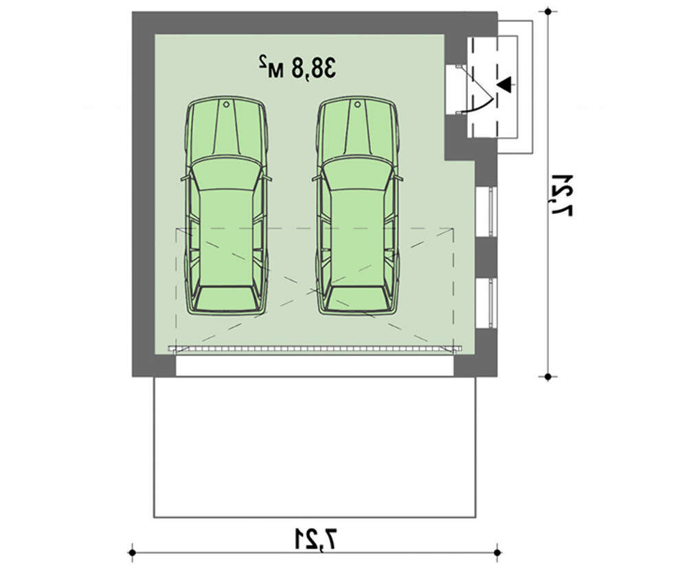 Проект сучасного окремого гаража для зберігання двох автомобілів припаде до душі забудовникам дачних ділянок і власникам резиденцій в котеджних селищах. Будова має квадратну форму, стіни викладені з пористого бетону, оштукатурені гідроізоляційними і іншими будівельними сумішами, пофарбовані водоемульсійні розчином в білий колір з жовтим відтінком. Будівля покрито шатрової дахом з натуральної черепиці коричневого кольору, скати обладнані пластиковими водостоками.