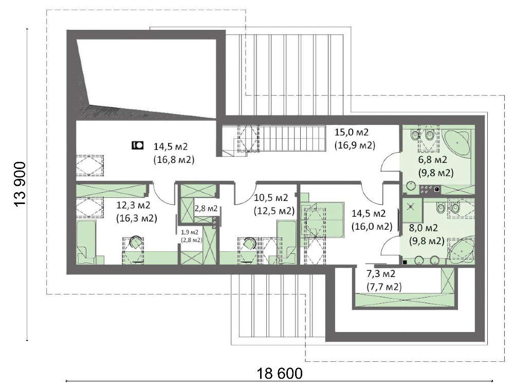 Другий поверх включає три спальні. Завдяки незвичайному плануванню, особисті кімнати включають великі гардеробні приміщення. Хазяйські апартаменти найбільш впорядковані. В їх площу включені власний санвузол, гардероб і напівзакрите простір балкона.