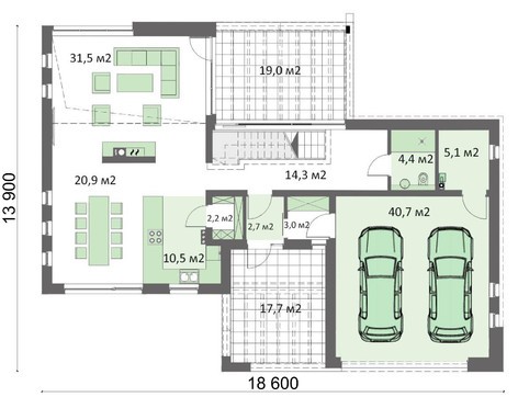 Житловий простір першого поверху максимально віддалений від просторого гаража на два авто. Планування спрямоване на створення максимальної тиші для відпочиваючих членів сім'ї. Додаткова кімната першого поверху може бути використана як майстерня для виконання сервісних робіт.
