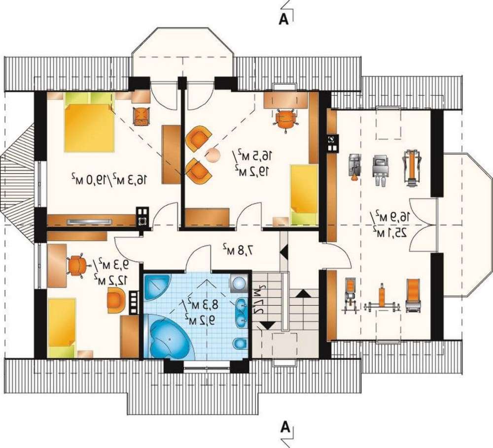Кут нахилу покрівлі:40°, 38°, 27 °