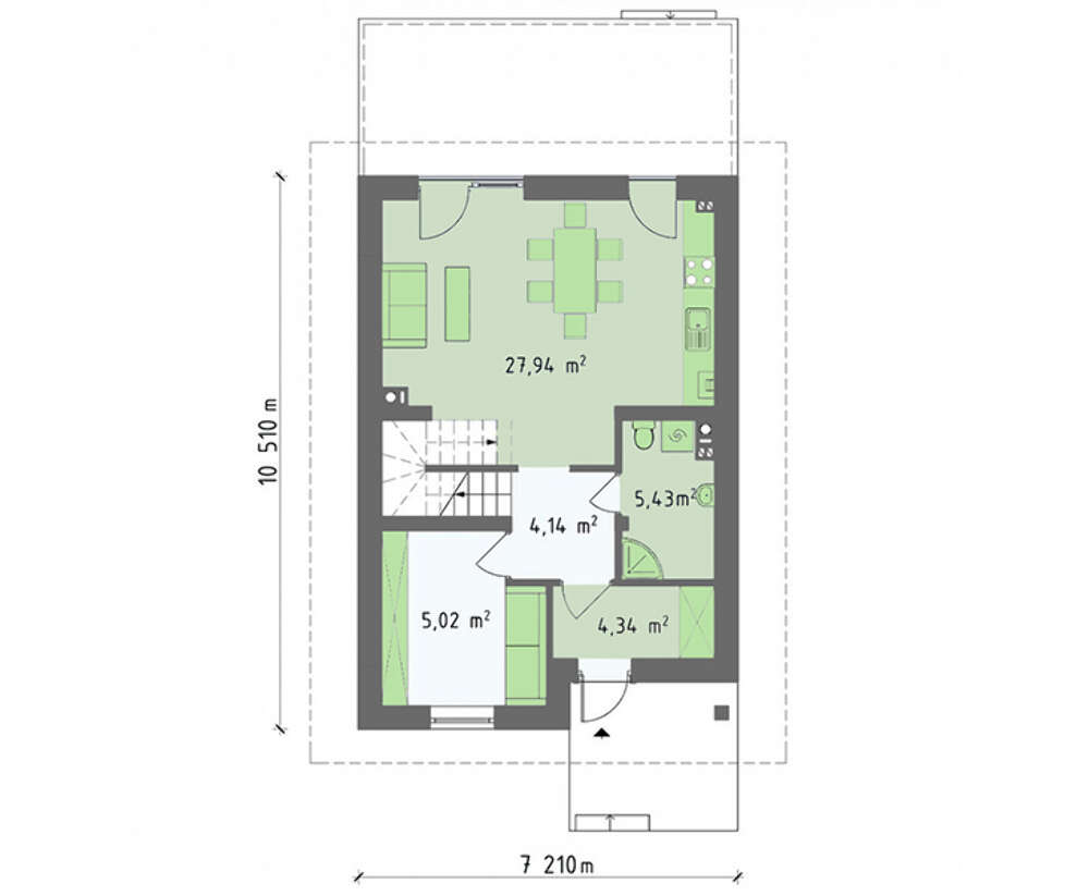 Проект невеликого затишного будиночка площею 100 кв. м стане вдалим придбанням для середньостатистичної української сім'ї. Має компактні габарити, що допоможе помістити його на ділянці практично будь-яких розмірів і форми. За функціональністю будинок не поступається комфортабельному сучасного житла. Проект можна використовувати як для будівництва дачі, так і для повноцінного заміського котеджу. Симпатичний екстер'єр гармонійно впишеться в будь-який ландшафт.