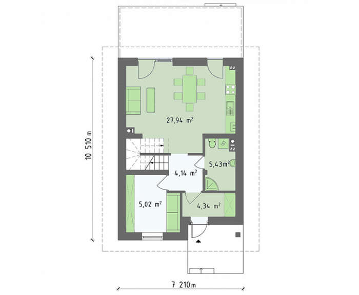 Внутрішній простір будинку підпорядковане догмам європейського стилю. Площа раціонально розподілена між кімнатами. Нижній рівень являє собою простору вітальню, отриману за рахунок злиття території кухні, їдальні і залу для прийомів. Відсутність перегородок робить кімнату ще більше і вільніше. Площа вітальні збільшується за рахунок примикає тераси.