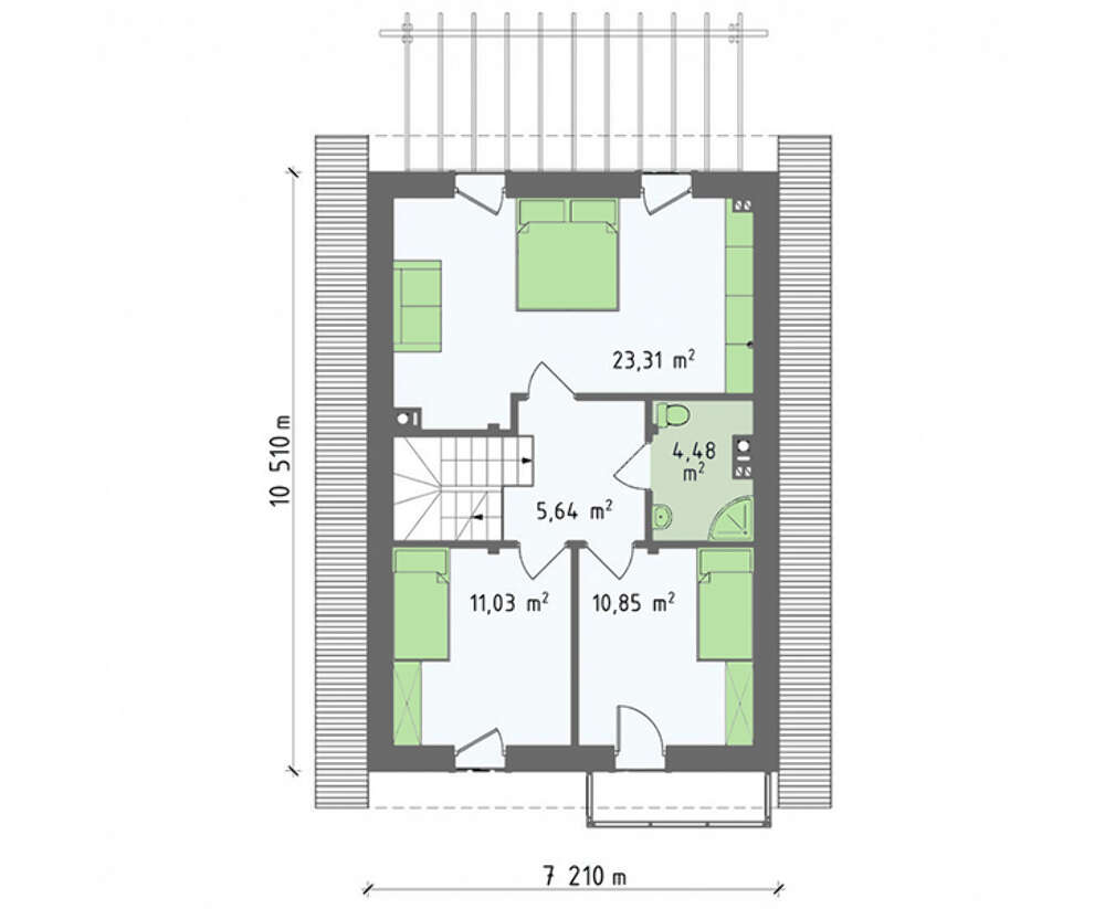 Що знаходиться на першому поверсі приміщення може бути використано в якості котельні, ігровий або кабінету на розсуд власника. На другому поверсі розташувалися спальні членів сім'ї. Їх три, всі вони забезпечені французькими балконами. У самій маленькій кімнаті він звичайний, що з лишком компенсує недолік площі.