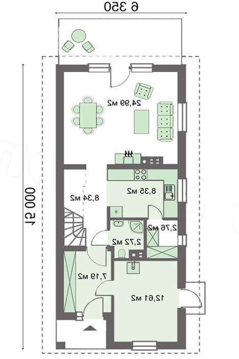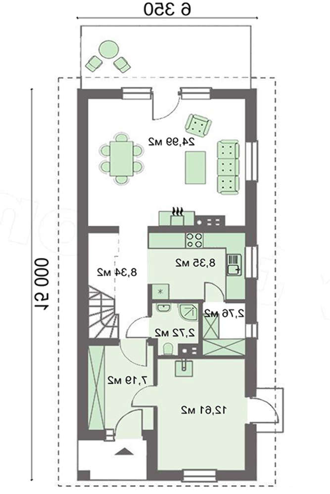 Торцева частина будинку віддана під їдальню і вітальню. Центральна визначена під камін - символ домашнього вогнища і опалювальний прилад одночасно. Окремий вихід на заміську ділянку дозволяє господарям та їхприятелям будь-яку зустріч продовжити на території садиби, насолоджуватися співом птахів, дзижчанням бджіл і нескінченно довго спостерігати за прохань метеликів.