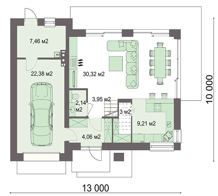 Вбудований гараж розрахований на зберігання одного авто, також прилягає просторе приміщення на сім квадратів, яке допоможе в комфортних умовах виконувати сервіс машини і слюсарні роботи по дому.