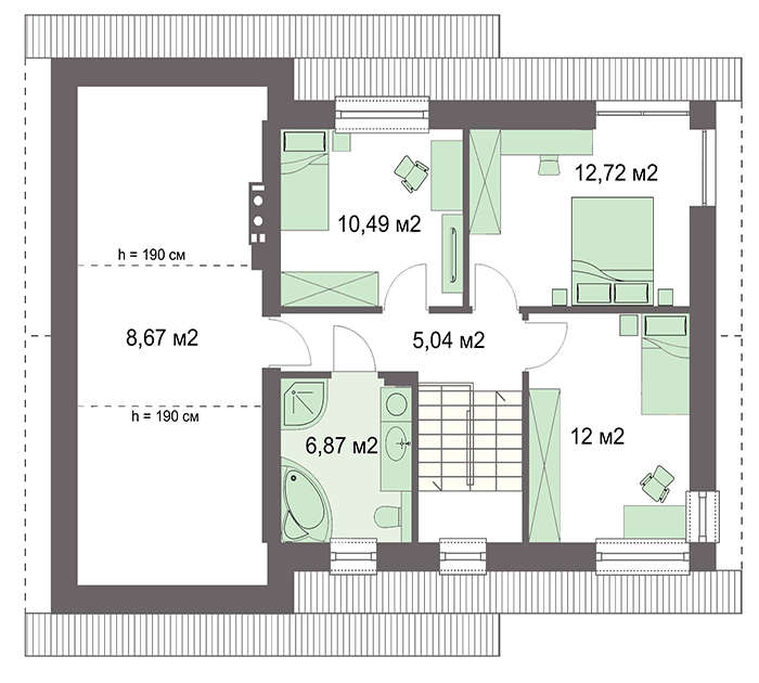 Другий поверх включає три спальні кімнати однакового розміру. Апартаменти виходять на різні сторони світу, кожен мешканець може підібрати приміщення по своєму смаку.