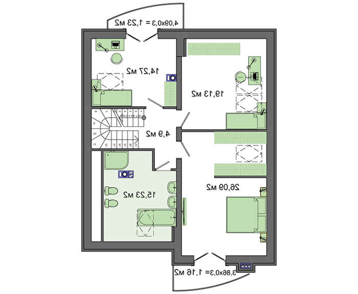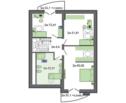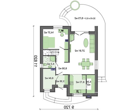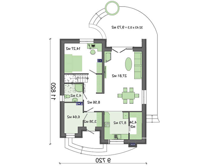 Внутрішній простір легко і просто поділено на комнати. Вітальня з'єднана з їдальнею, відсутність перегородок дозволила отримати значний простір, наповнений світлом, з хорошою вентиляцією. Під кухню віддано окреме приміщення, площа в 14 м2 дає можливість не тільки готувати їжу, але і влаштовувати сімейні обіди. Господиня належним чином оцінить наявність комори. Її значні розміри і розташування поруч із зоною приготування їжі спрощує жіноча праця.