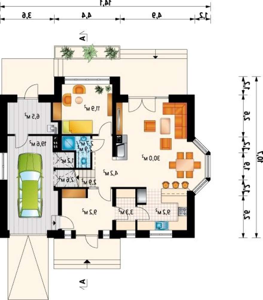 Головне достоїнство котеджу в плануванні, житловий простір раціонально розділений на зони. На особливу увагу заслуговує кухня-студія. Її центральна частина виділена під еркер, що дозволяє наповнити приміщення світлом і надає йому величавості. Просторий передпокій має достатні габарити для зустрічі великої компанії. З неї передбачено відразу кілька виходів: в загальну частину, гараж на одну машину і кухню. За рахунок такого дизайнерського прийому потрапити в потрібне приміщення стало набагато простіше.