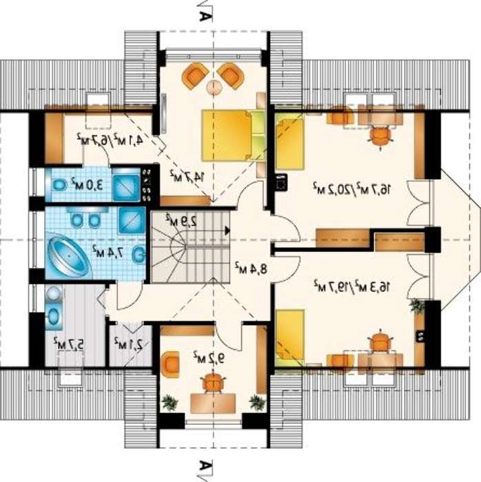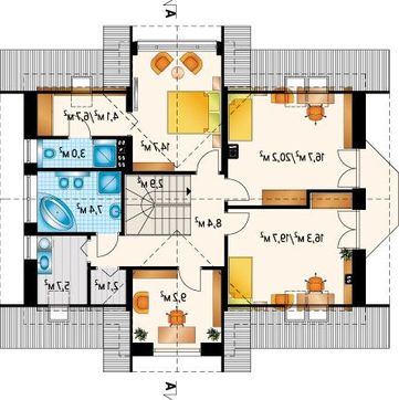 Передбачено 4 спальні, одна з яких розташована на першому поверсі. Невеликий кабінет другого рівня дозволить власникові в масштабах будинку вирішувати питання бізнесу. Завдяки трьом санітарним приміщень можна нескінченно довго ніжитися у ванні або співати пісні при прийомі душа.