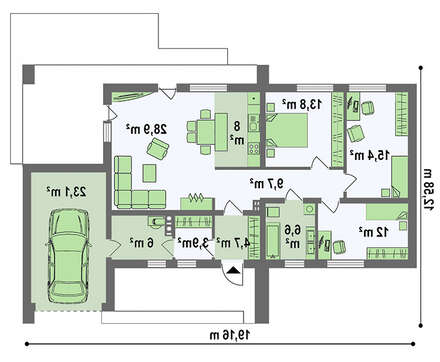 • 4M440a Класичний одноповерховий будинок для вузької ділянки площею 130 m²