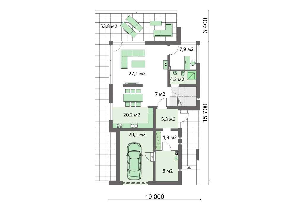При плануванні першого поверху додатково виділена невелика кімната. Її площа, за бажанням господарів, може бути використана для спальні, бізнес-кабінету або приміщення для дитячих ігор.