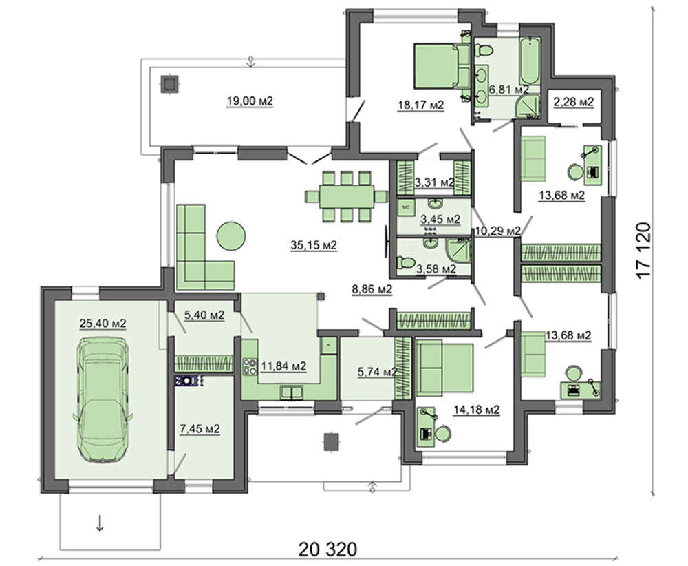 Всі наші типові проекти враховують основні потреби середньостатистичної сім'ї, щоправда, в такому випадку говорити про індивідуальність вашого майбутнього житла не доводиться. Але, щоб будинок виглядав оригінально і повністю відповідав вашим вимогам, ми готові внести зміни в проект.