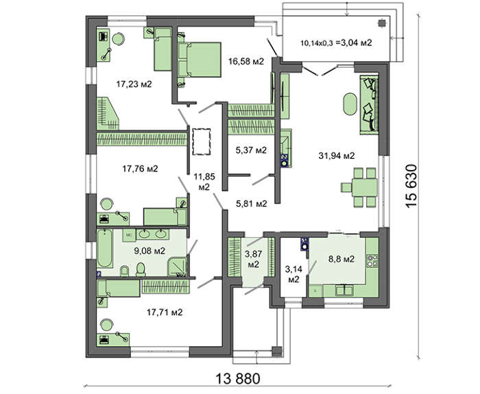 • 4M573 Планування компактного одноповерхового житла на 4 спальні