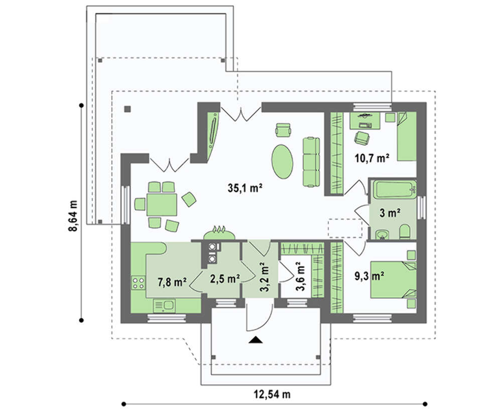 Гарний одноповерховий котедж прекрасно підійде для сезонної дачі. Невеликі габарити дозволять помістити будинок на ділянці будь-якої площі, включаючи наділи в 6 соток. Проста архітектура без пафосу й надмірностей, ненав'язливий декор у вигляді дерев'яної обробки і граціозний портал з ганку з колонами відносить котедж до європейського стилю. Екстер'єр будинку забезпечує суворий урочистий контраст білих стін і темної покрівлі, пом'якшений світло-коричневим деревом.