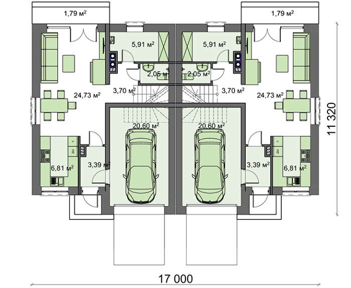 Сучасний стильний таунхаус виглядає потужно і яскраво. Використання в якості покриття нейтральних тонів отримує схвалення власників. Будинок розрахований на проживання двох сімей. Найчастіше на такому плануванні зупиняються родичі або друзі, які бажають мешкати поруч, але незалежно. При цьому в наявності економія на будівництві.