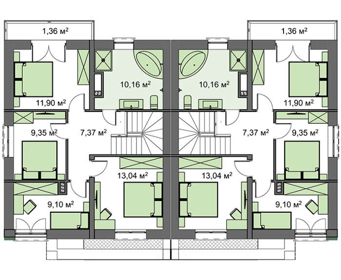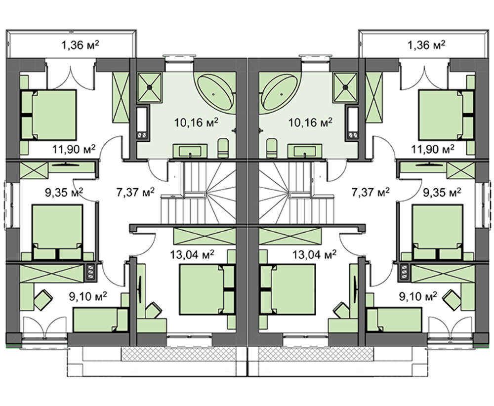 Всі чотири спальні підняті на другий поверх. Кімнати мають невелику площу. На рівні для мешканців будинку передбачені загальні санпомещенія. Привілеї дані господарям тільки однієї спальні за рахунок виходу на балкон.