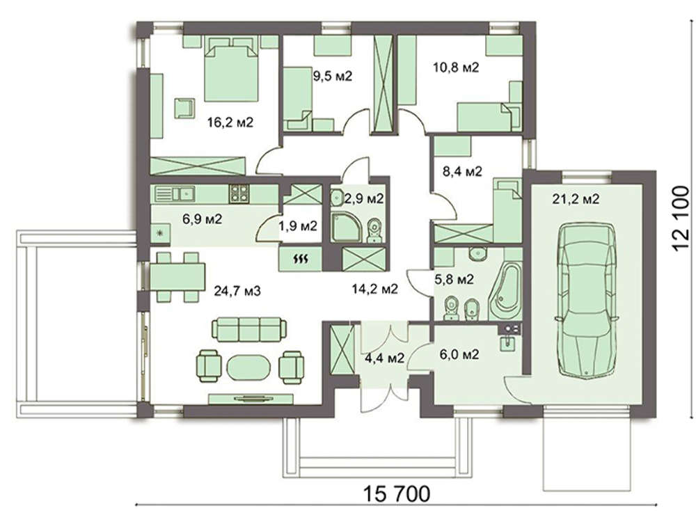 При проектуванні раціонально використовується простір. Крім житлових приміщень передбачені гардеробні кімнати та санвузли. Чотири спальні відрізняються габаритами, господар може вибрати для себе найбільш комфортабельні апартаменти.