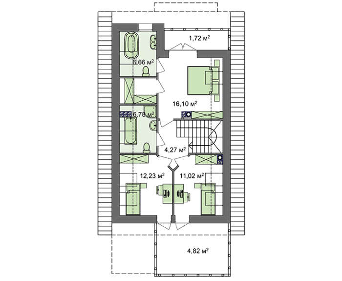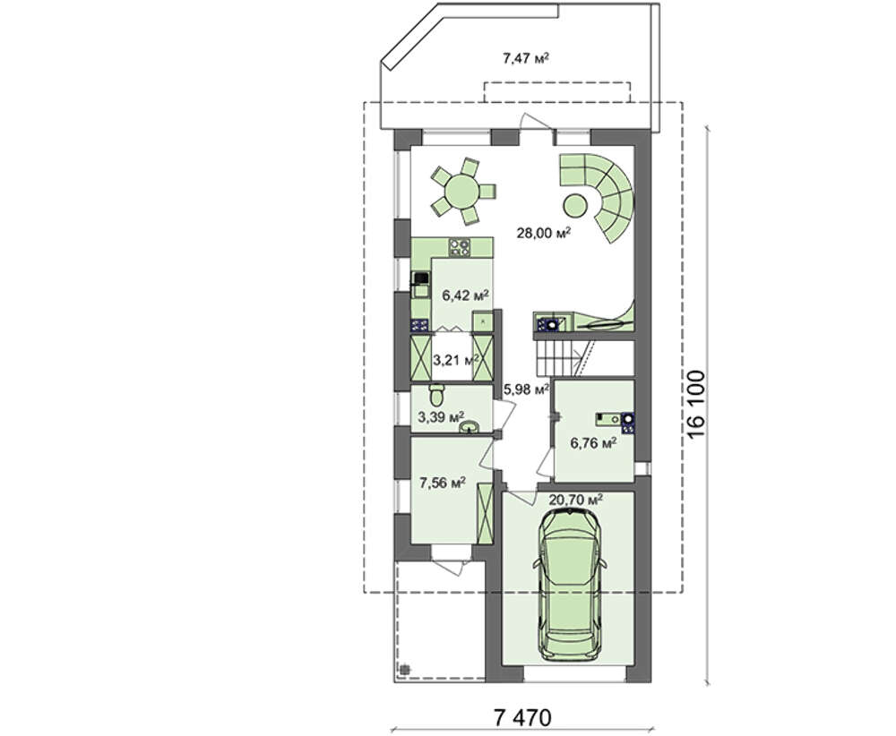 Проект будинку для вузької ділянки, з гаражем і терасою над ним