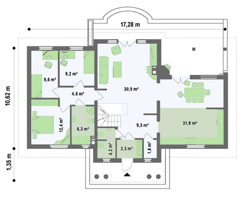 Проект 4M164 ідеально підходить сім'ям, які цінують класику, традиції і хочуть створити атмосферу респектабельного затишку. Будинок у ретро-стилі підкреслить ваш смак і особливу значимість будинку як сімейного центру.