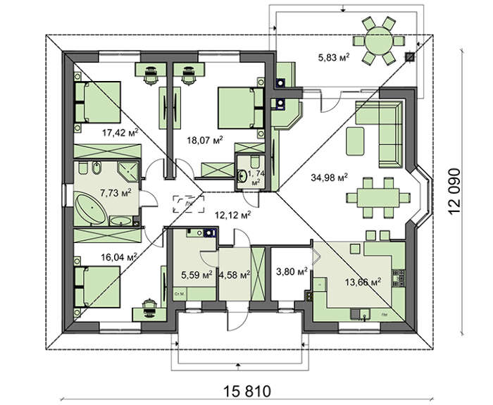 Пропонуємо один з найбільш популярних проектів - одноповерховий будинок з багатоскатним дахом і еркером. Він чудово поєднує в собі традиційний архітектурний стиль і сучасне планування внутрішніх приміщень.