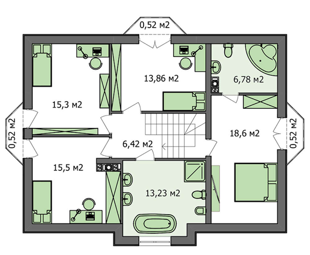 Шикарний особняк в два поверхи сподобається багатьом забудовникам. Таким будинком можна милуватися годинами. До того ж вивчивши його функціонал, розумієш, це те, що потрібно. Особливо якщо у клієнта велика сім'я, і кожної людини необхідно забезпечити власною спальнею.
