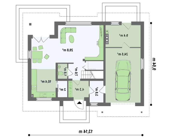 Перший поверх спроектований максимально функціонально: тут розташовується зручний гараж на одне авто та господарське приміщення, що забезпечує зручність зберігання та обслуговування. Також на цокольному рівні передбачені простора вітальня, кухня-їдальня, додаткова спальня та гігієнічна зона. Таке планування підходить для батьків із бабусями або для організації домашнього офісу.