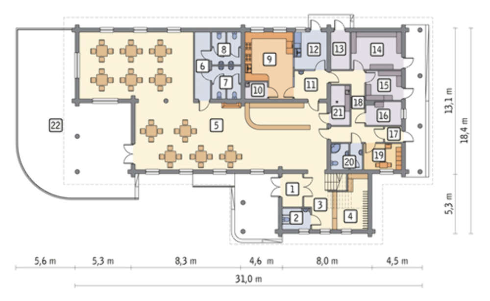 Проект дерев'яної будови під підприємство громадського харчування з житловими апартаментами 4M6300s