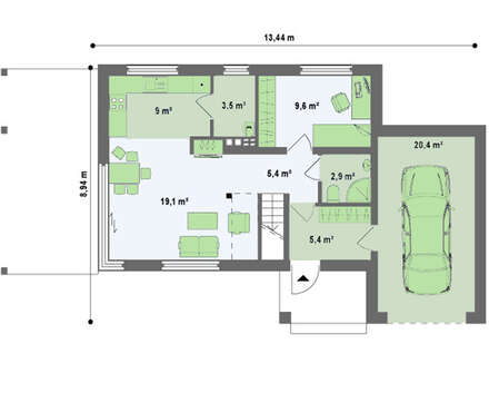 Внутрішнє планування раціональне і функціональне. Приміщення невеликі, але гостинний зал збільшений за рахунок відсутності перегородок між зоною відпочинку, їдальнею і кухнею. Остання межує з котельнею, яка додатково використовується як комора. Кімната відпочинку першого поверху зазвичай віддається під спальню для літніх членів сім'ї або обладнується як кабінет.