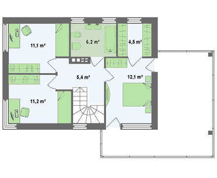 Стильний котедж в традиціях сучасного мінімалізму порадує не тільки модним зовнішнім виглядом, а й компактними розмірами. Будинок можна розташувати практично на будь-якій ділянці і навіть дуже вузькій. При своїх невеликих габаритах він повністю функціональний. Тут є все для комфортного проживання сім'ї з 4-5 чоловік.