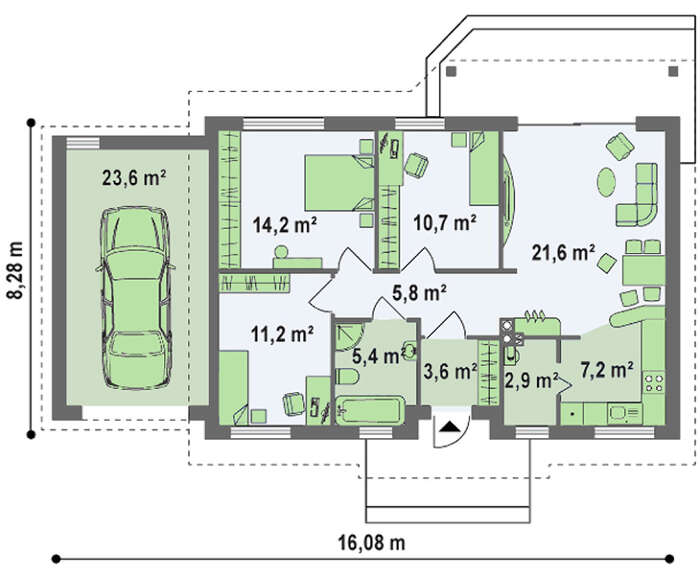 Проект комфортного затишного одноповерхового котеджу з гаражем 4M476G