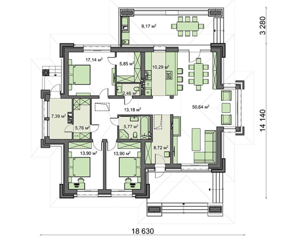 Проект компактного будинку площею 164 кв. м з трьома особистими спальнями 4M1474