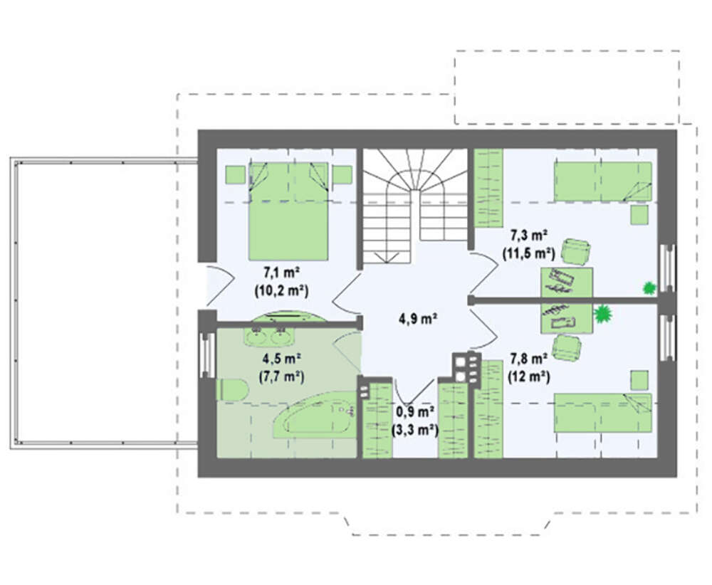 Будинок має функціональне планування, що підходить для сім'ї з 3-4 осіб. На першому поверсі розташовані сучасна вітальня, об'єднана з кухнею-їдальнею, санвузол та гараж. Затишна тераса додає місце для відпочинку на свіжому повітрі, що особливо цінується в теплу пору року. Мансардний поверх включає три спальні та ще один санвузол, забезпечуючи комфортну приватну зону для кожного члена сім'ї. Цей будинок підійде як для молодої пари з дітьми, так і для сім'ї з бабусею та дідусем, враховуючи наявність гостьової кімнати на мансарді.