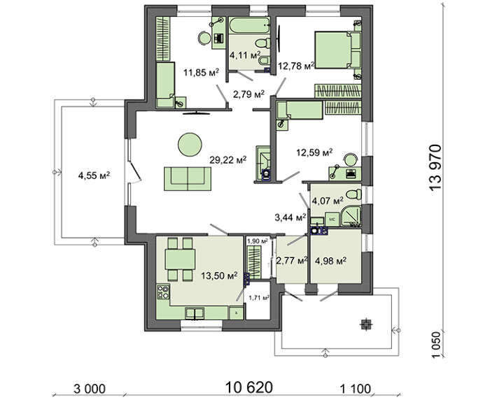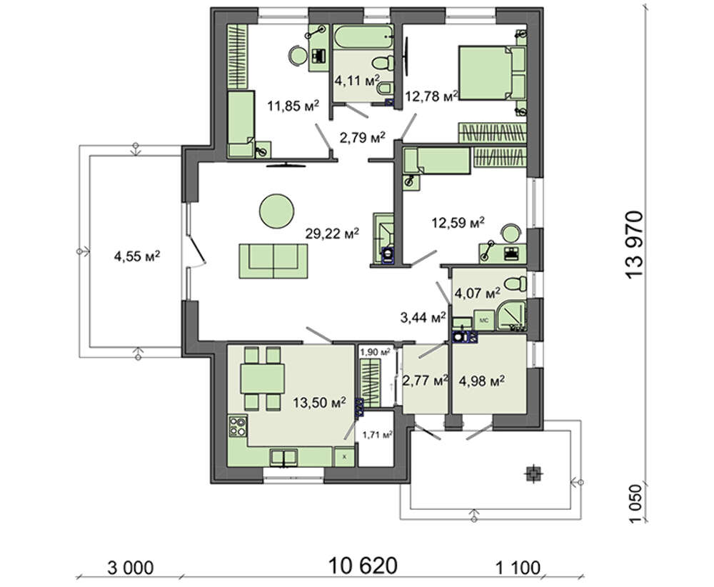 Всі наші типові проекти враховують основні потреби середньостатистичної сім'ї, щоправда, в такому випадку говорити про індивідуальність вашого майбутнього житла не доводиться. Але, щоб будинок виглядав оригінально і повністю відповідав вашим вимогам, ми готові внести зміни в проект.