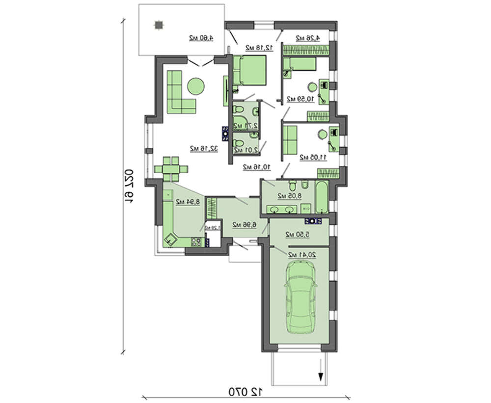 Чудовий одноповерховий котедж, виконаний в німецькому стилі, стане не тільки окрасою заміської ділянки, а й комфортабельним житлом для середньостатистичної сім'ї. В основі європейської архітектури лежать принципи раціоналізму і практичності. Це втілено як в екстер'єрі, так і в плануванні будинку. Котедж представлений прямокутною коробкою з прибудованим приміщенням гаража. Невеликий цоколь, ганок вітальні і вхідний портал декоровані штучним каменем. Окрасою будинку є простора відкрита тераса з колоною і дерев'яною конструкцією для літнього сонцезахисного навісу. Вікна прямокутні, двері панорамні, дах чотирьохскатний з металочерепиці.