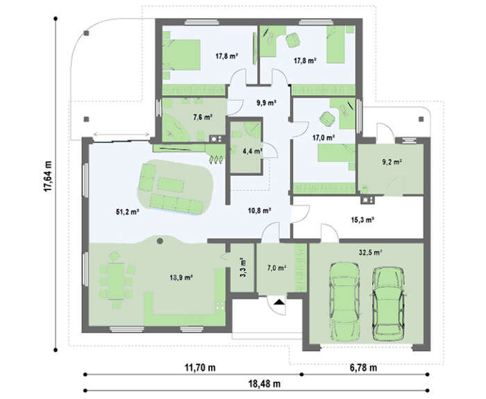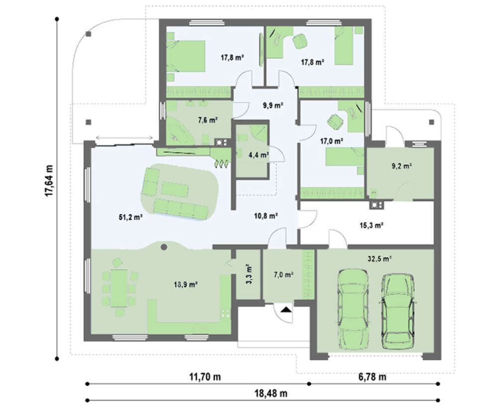 Проект одноповерхового будинку з гаражем для 2 машин 4M492