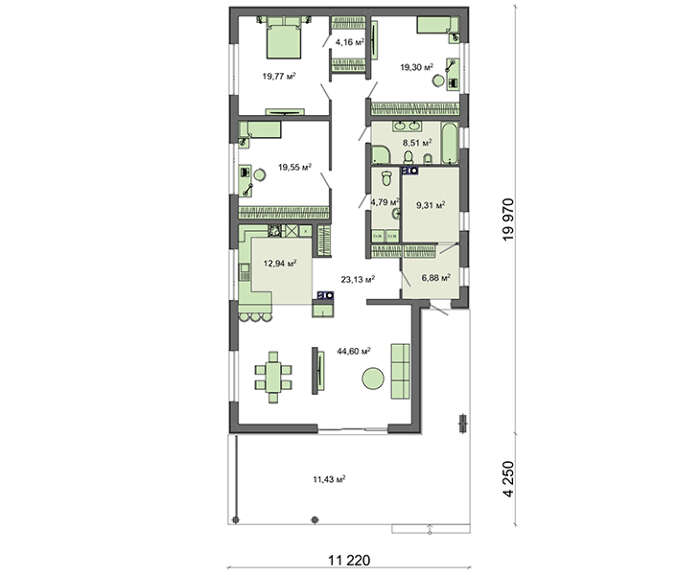 Проект одноповерхового котеджу з 3 спальнями для вузької ділянки