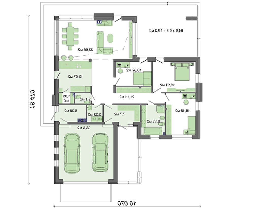 Стильне сучасне приміщення вражає красою. В його оформленні використані натуральні матеріали. Світле дерево добре поєднується з темною цегляною кладкою. Білосніжні ділянки стін підкреслюють красу обох матеріалів. Незважаючи на одноповерховий варіант, житловий будинок включає всі необхідні для комфорту площі.