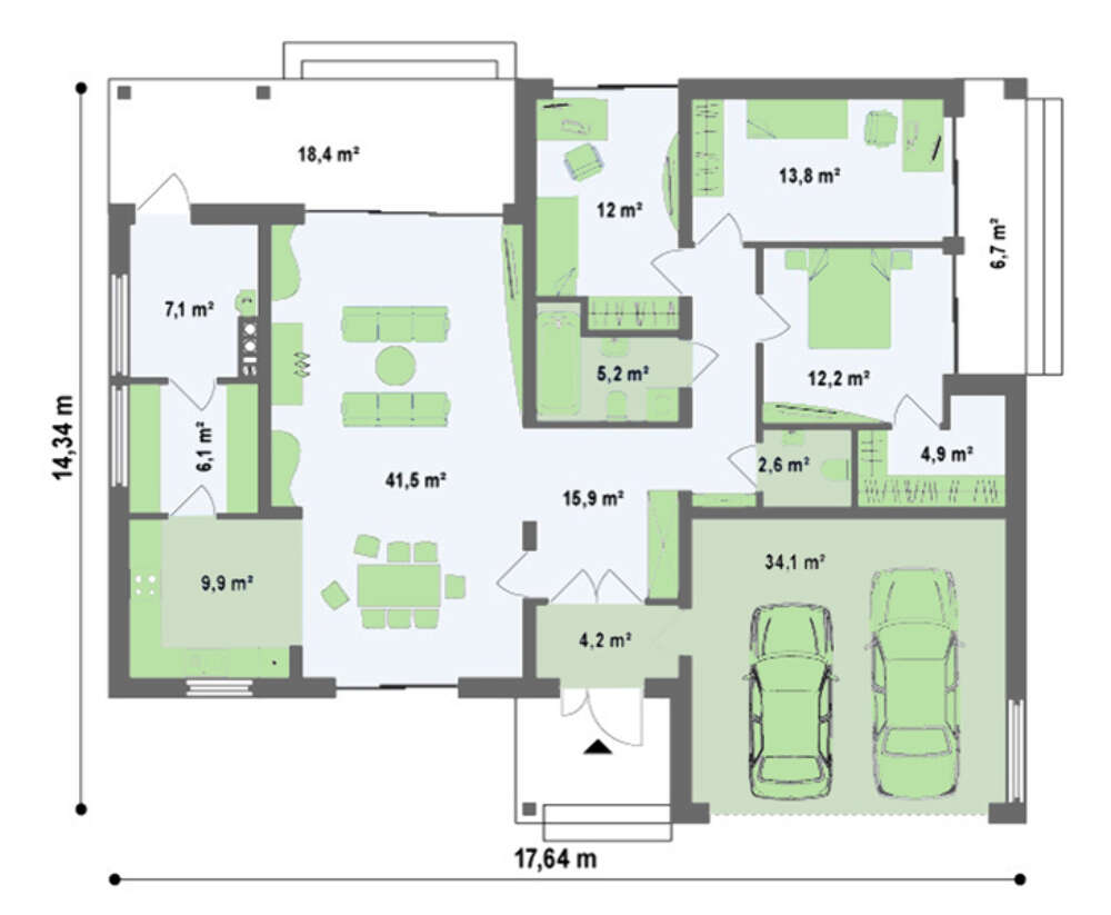 Проект одноповерхового котеджу з гаражем і критою терасою