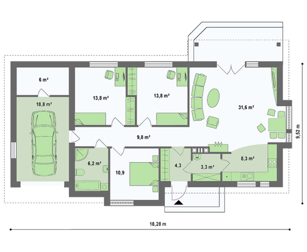 Проект одноповерхового котеджу загальною площею 121 кв.м. 4M7057