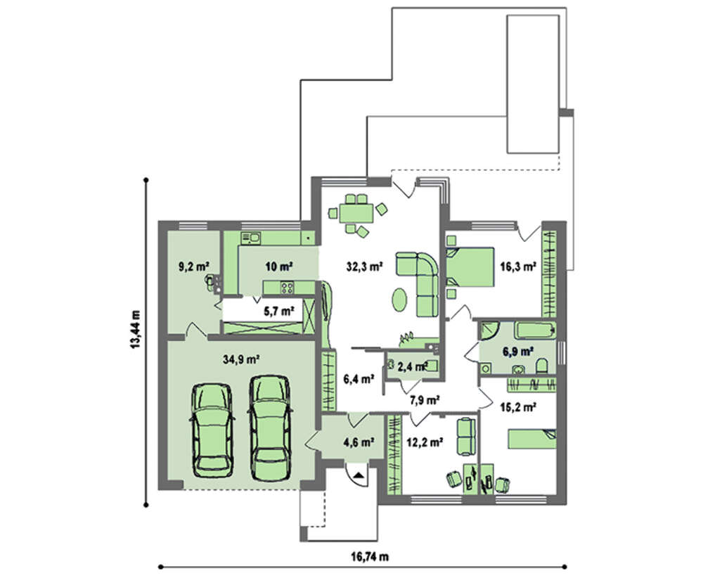 Проект сучасного котеджу з плоским дахом і гаражем для двох авто