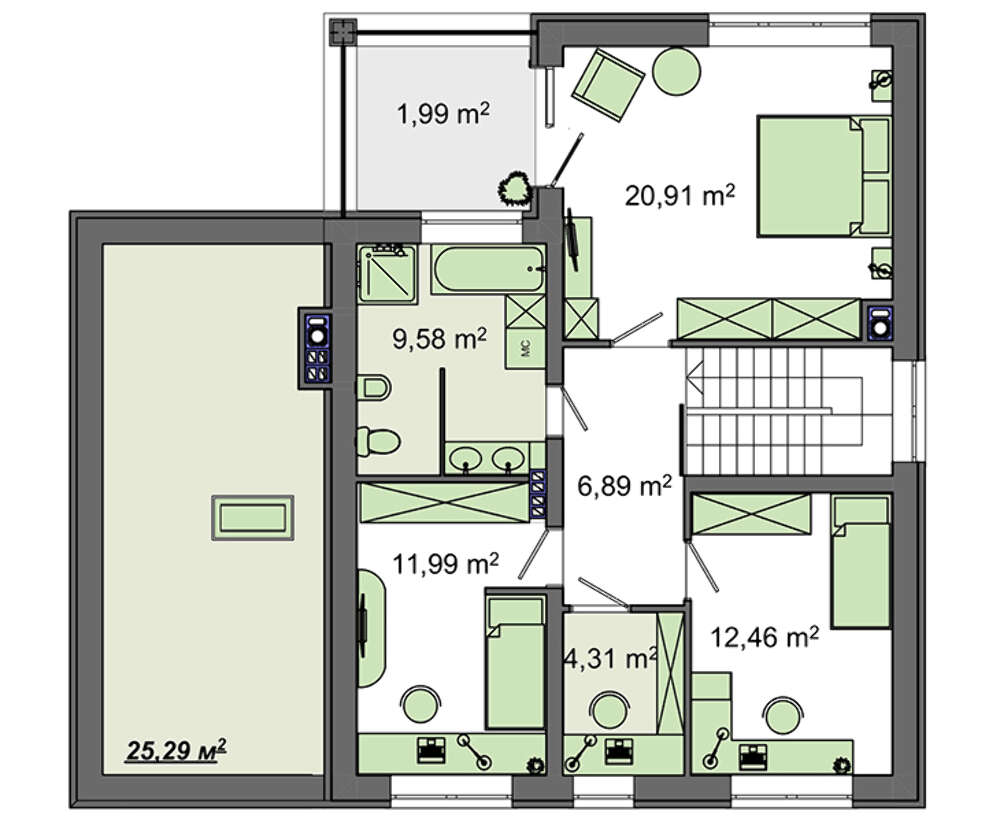 Про внутрішньому плануванню таких будинків можна сказати, що вони чітко розділені на житлову і нежитлову площу. У першій знаходяться особисті спальні членів сім'ї та супутні кімнати: санвузли та гардероби, у другій приміщення загального користування: вітальня-їдальня, кухня, кабінет, гараж, передпокій, котельна і туалет.