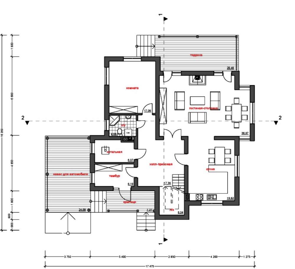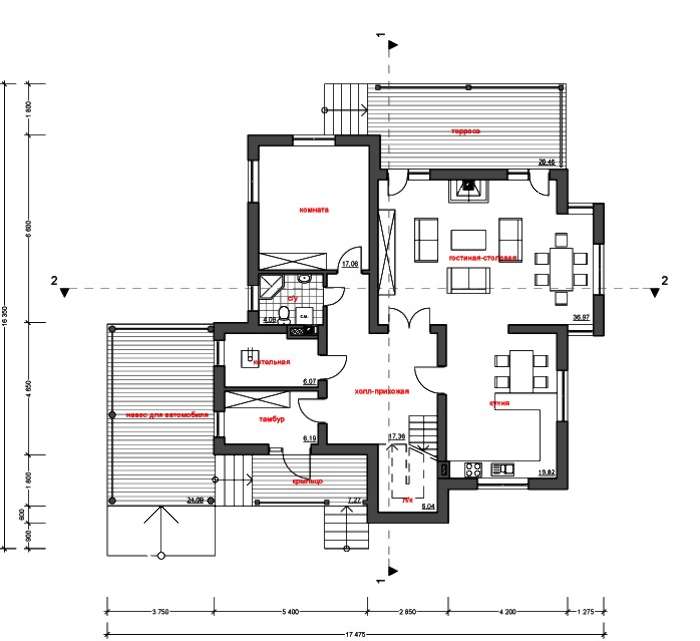 Проект житлового будинку з терасою і навісом для автомобіля 4M1843