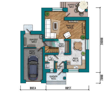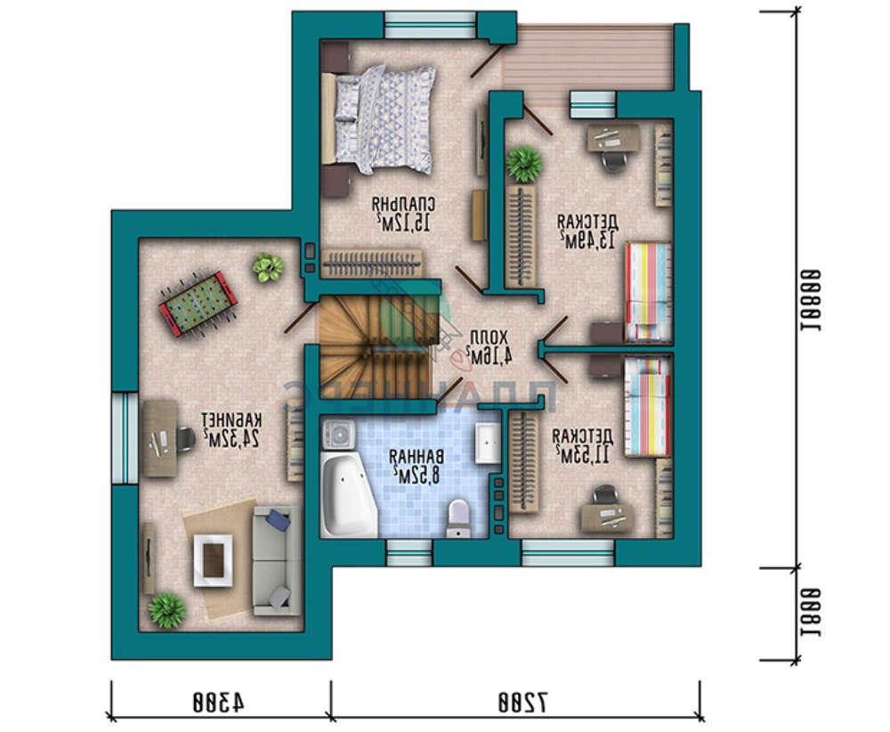 • 4M1433 Схема двоповерхового котеджу площею 161 кв.м, декорованого сірим цеглою і натуральним деревом