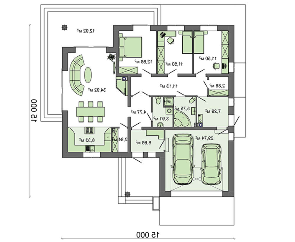 • 4M651 Схема одноповерхового котеджу площею в 166 кв. м з вбудованим гаражем на 2 автомобілі