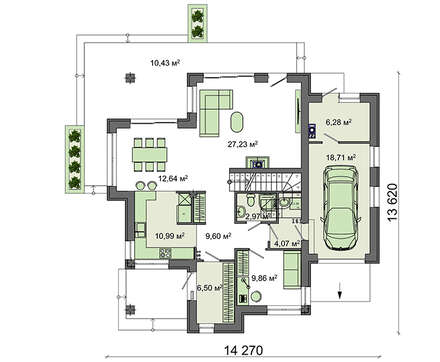 Загальна частина першого поверху виконана без роздільних перегородок. Таке планування дозволяє наповнити рівень сонячним світлом і сприяє гарному повітряобміну. Є площа для зберігання автомобіля і виконання сервісу.