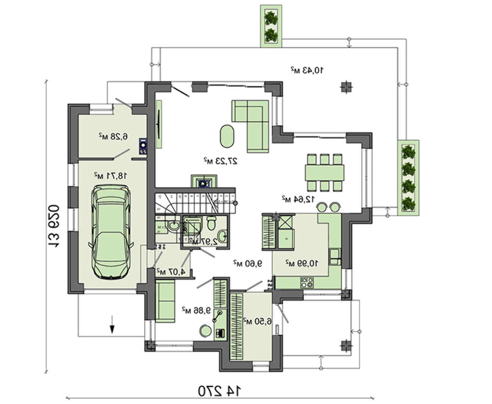 Загальна частина першого поверху виконана без роздільних перегородок. Таке планування дозволяє наповнити рівень сонячним світлом і сприяє гарному повітряобміну. Є площа для зберігання автомобіля і виконання сервісу.