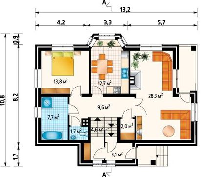 Перший поверх - вітальна зона, що включає просторий зал з каміном і зимовим садом для організації дружніх зустрічей і світських прийомів, кухню з обіднім столом в еркері, кімнату відпочинку для членів сім'ї старшого покоління.
