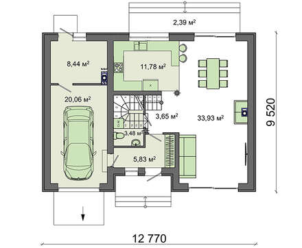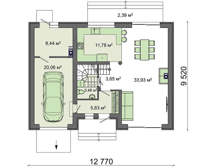 Перший поверх включає тільки кімнати, в яких сім'я збирається разом. Майже в двадцять квадратів площею гараж впорається з розміщенням автомобіля представницького класу. Передбачено місце під майстерню, на її території, в безпосередній близькості до площі гаража зручно виконувати всі сервісні роботи.