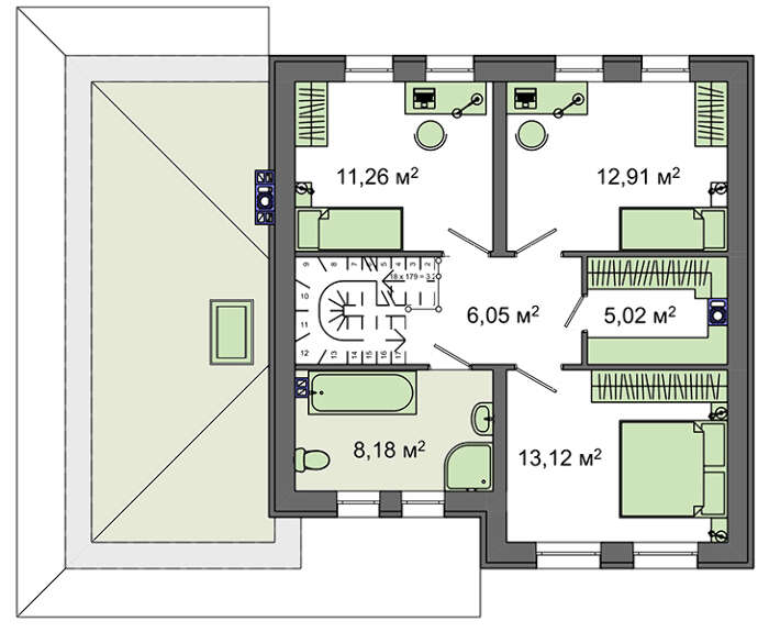 Три спальні кімнати віднесені на другий поверх. Додаткові зручності створені за рахунок загальних приміщень: санвузла і гардероба.