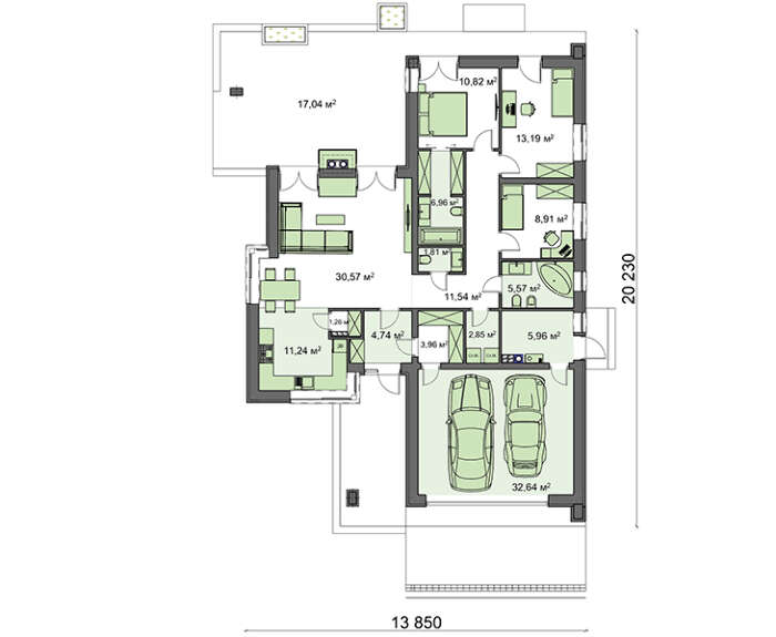 Для того щоб забезпечити повноцінний якісний відпочинок, простір поверху розділений на три зони. Гараж представлений просторим приміщенням для зберігання двох автомобілів і окремою кімнатою, яку можна використовувати для проведення сервісних робіт і зберігання, необхідного в господарстві інструменту.